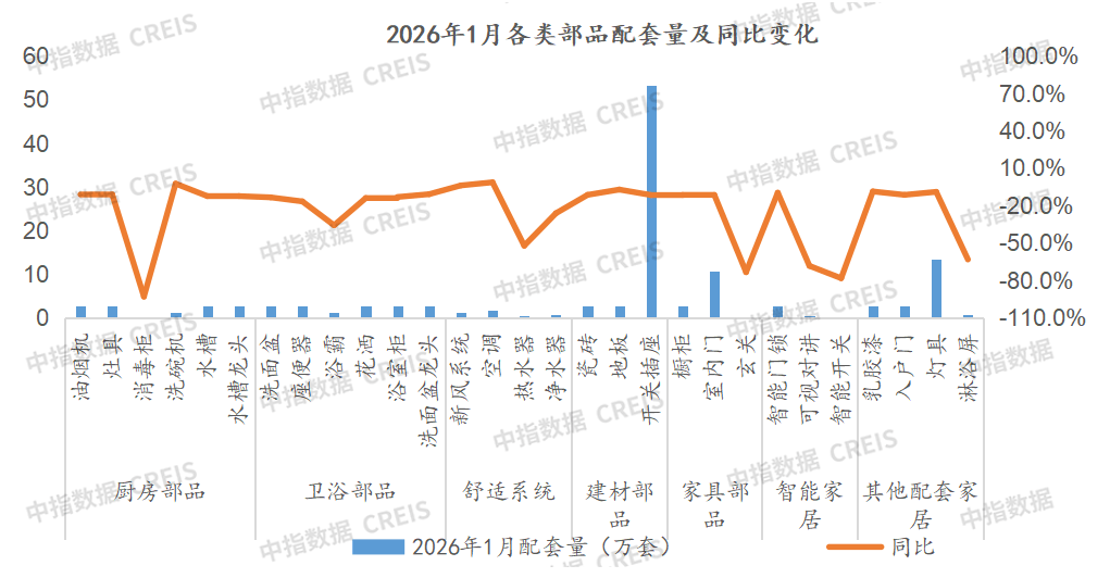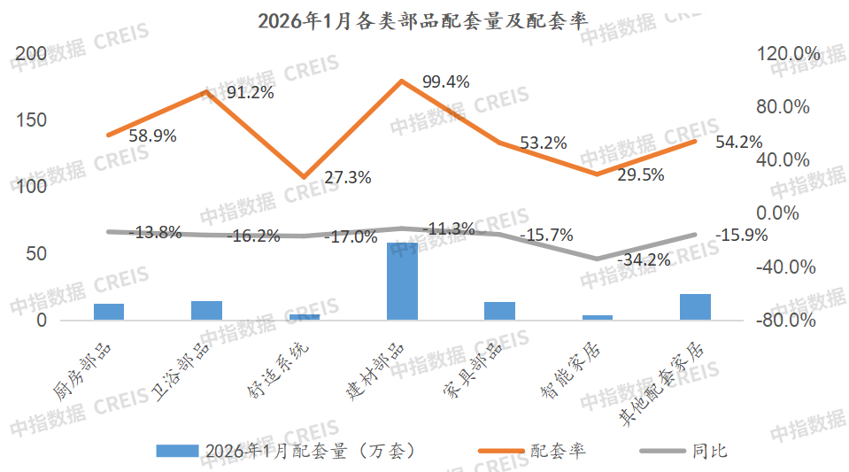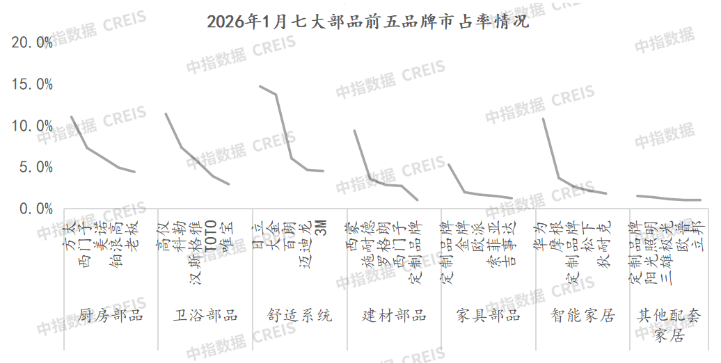 2026年1月,提高0.32和1.34个百分点。包罗热水器、玄关、可视对讲、淋浴屏、浴巾架等降幅跨越20个百分点。厨房部品、卫浴部品和舒服系统部品品牌前三合计占比跨越20%。2026年1月企业精拆部品配套量最高的是中国金茂,同比下降7.6%。
